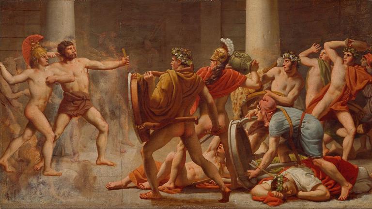 At one point, an old beggar arrives at the house seeking hospitality. Antinous throws a footstool at the man, only for it to harmlessly bounce off him, like bullets ricocheting off Superman. What’s going on? Turns out the elderly man was actually Odysseus in disguise, with Athena having worked her magic once again. Odysseus proceeds to kill Antinous by firing an arrow through his throat.